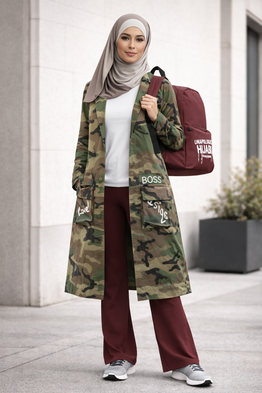 A layered streetwear look with clean lines and bold attitude finished with our signature Unapologetic Hijabi crossbody.