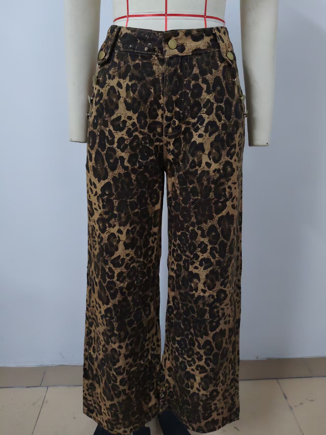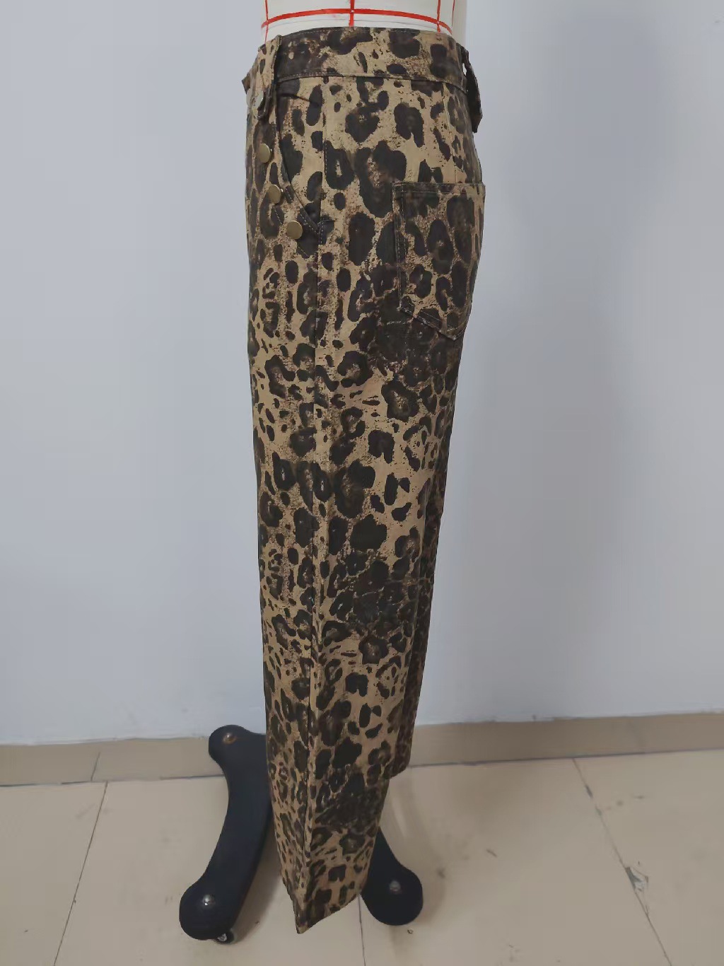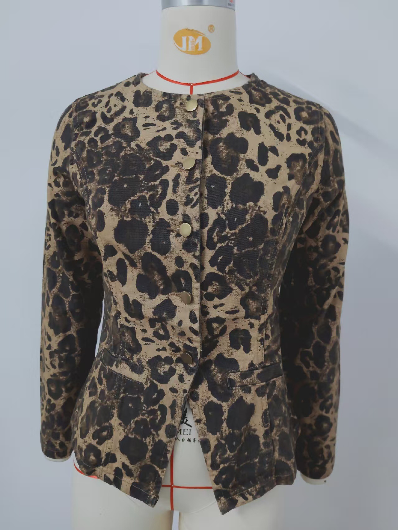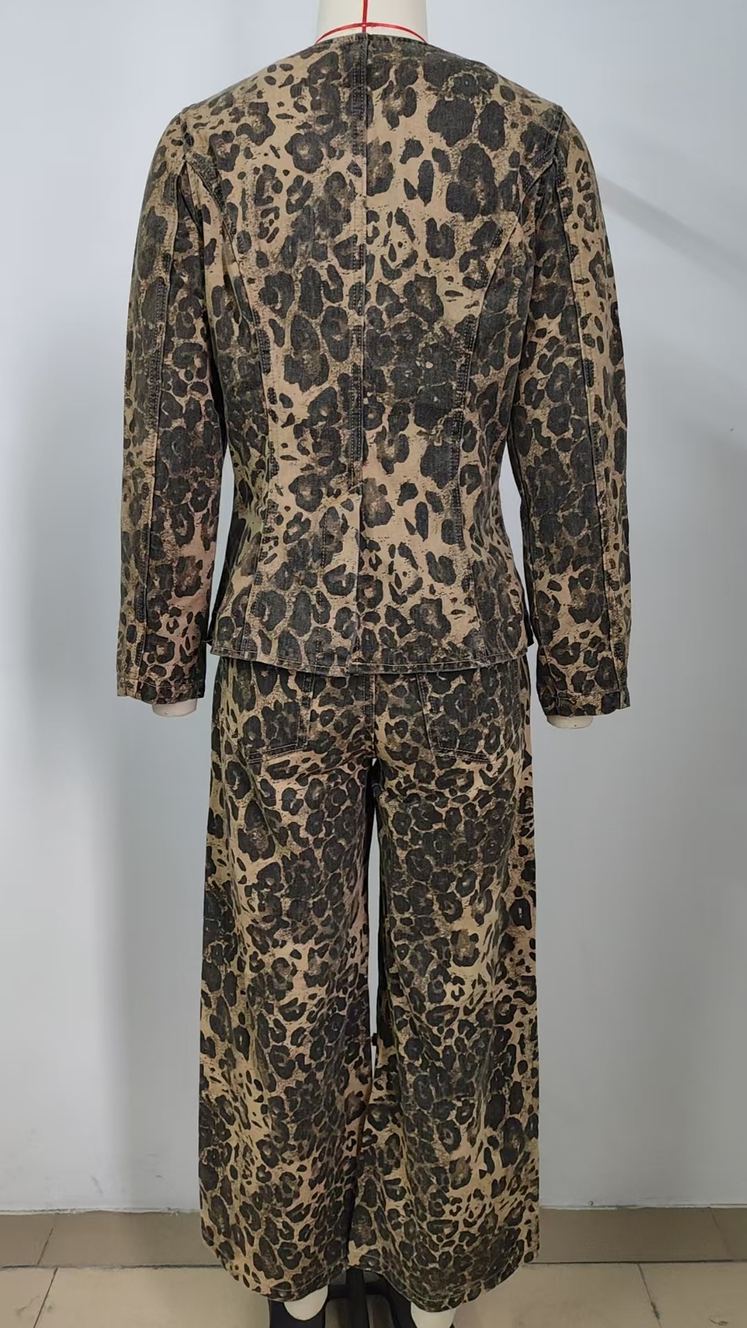 Washed Leopard Print Denim Long Sleeve Top Set for Women