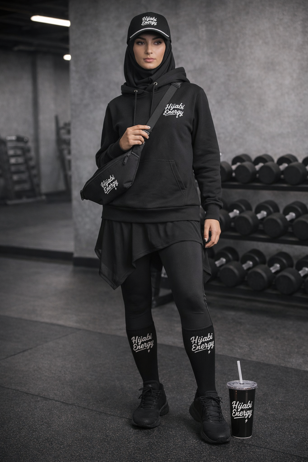 A timeless modest look featuring a black hoodie, skirted legging set, hat, and optional essential layers